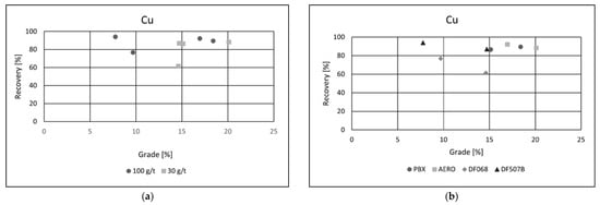 Figure 6. Grade/recovery diagrams of copper recovery with respect to collector dosage (a) and collector type (b).