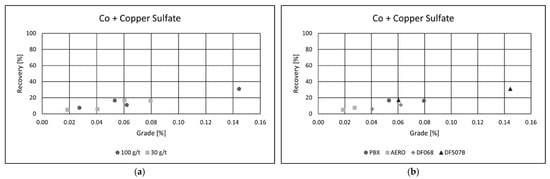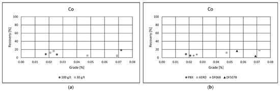Collector type had a notable impact on flotation performance. Among the tested reagents, PBX and AERO produced the best results, achieving both high copper recoveries and superior concentrate grades. Their effectiveness is likely due to stronger and more selective adsorption onto copper-bearing minerals, enhancing separation efficiency. In comparison, the other two collectors yielded similar recoveries but resulted in significantly lower copper grades, suggesting reduced selectivity and increased entrainment of gangue minerals. These results emphasize the importance of choosing appropriate collectors to optimize both recovery and concentrate quality in copper flotation. Grade/recovery diagrams of cobalt flotation performance are shown in Figure 7a,b.