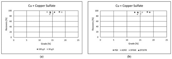 In the test using PBX at a dosage of 100 g·t−1, the flotation process achieved a copper recovery of 95.47%, with a final concentrate grade of 17.69% Cu. These results highlight the effectiveness of copper sulfate as an activator and confirm PBX as the most suitable collector under the tested conditions for maximizing both recovery and concentrate quality. The addition of copper(II) sulfate as an activator had a clear positive effect on cobalt flotation performance (Figure 9a,b).