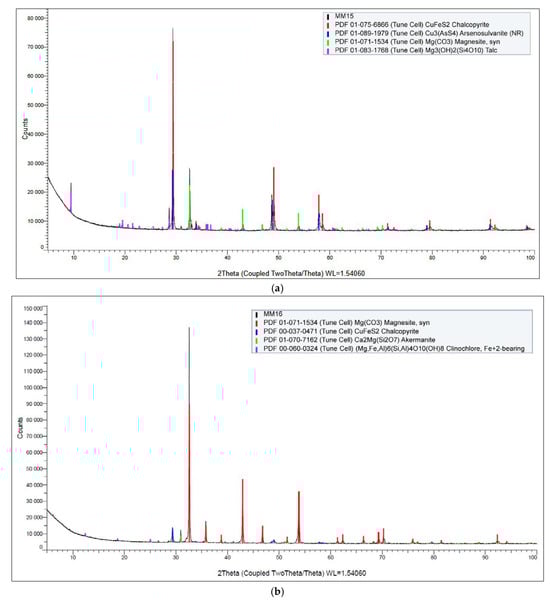In contrast, Figure 10c,d shows the corresponding SEM and DX analyses for the cobalt-selective concentrate. In this case, cobalt was detected at a concentration of approximately 0.4%, indicating successful enrichment of cobalt relative to its original content in the feed material. These findings support the effectiveness of the sequential flotation strategy in isolating target metals into discrete, high-grade concentrates. Figure 11a,b displays the X-ray diffraction (XRD) patterns of the selective copper and cobalt concentrates, respectively.