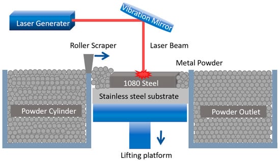 LPBF processing was performed using an HBD-80 system (Hanbang Union 3D Technology Co., Ltd., Shanghai, China) equipped with a YLR-500 fiber laser (beam diameter: 33 μm; wavelength: 1060 nm). Prior to fabrication, 1080 steel powder was dried for 8 h in an argon-purged desiccator to eliminate residual moisture and prevent pore formation. During printing, continuous argon flow maintained oxygen levels below 5 ppm to suppress interlayer oxidation (Figure 2 illustrates the LPBF scheme). Based on previous research, process parameter development employed the following ranges: laser power (P) = 100–375 W, scan speed (V) = 400–600 mm/s, hatch spacing (H) = 120 μm, and layer thickness (t) = 30 μm. The volumetric energy density (VED), calculated as VED = P/(V·H·t), ranged from 46.3 to 260.4 J/mm3, providing a preliminary indicator of energy input. Table 2 details the 16 parameter combinations and corresponding VED values used for specimen fabrication. Conventional mechanical testing approaches would incur prohibitive time and resource costs for this parameter matrix. Consequently, we employed our self-developed high-throughput testing platform [22] to efficiently acquire tensile property data, with three tests conducted per set and the results averaged.