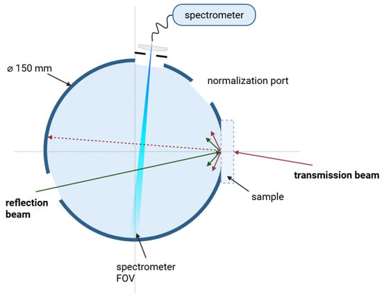 To accurately compare the measurement with the Monte Carlo simulation, the specific characteristics of the experimental environment must be taken into account. Photons emerging from a sample slab, either in transmission or reflectance, can enter the integrating sphere depending on their exit angle, position, and the sphere’s geometry. The measurement setup, as delineated in [29], utilizes a 150 mm diameter integrating sphere. The integrating sphere is coupled to a spectrometer (HR6 XR, OceanOptics, Orlando, FL, USA) with a 2048-pixel CCD array. Equipped with a 300 lines/mm grating and a 100 µm entrance slit, it has an optical resolution of 3.7 nm over a 200–1100 nm spectral range. The detector exhibits a dynamic range of approximately 12,000:1. To calibrate the system response, including the integrating sphere, the coupling optics and spectrometer, a broadband reference source with known output spectrum was measured using a power meter. This enabled the conversion of measured counts to radiant power. Detector linearity was independently verified in the relevant intensity range and found to be sufficient. In order to minimize the influence of the sample on the internal mixing process, the sample is mounted externally to the sphere. Excitation for reflectance measurements is achieved through an opposing port, thereby ensuring clear separation between transmitted and reflected light, thus reducing systematic errors. A schematic overview of the setup is shown in Figure 1, highlighting the external sample placement and separation of the transmission and reflection beams. The inner surface of the sphere is coated with barium sulfate, and the setup contains four ports, as follows: a reflection port, a normalization port, a sample port, and a detector port. The use of a baffle is avoided, as this has been shown to disrupt the internal mixing process within the sphere. However, this configuration allows for the direct illumination of the detector field of view (FOV) by photons reflected by the sample, emitted or re-emitted due to fluorescence. A proportion of the emitted light may also escape through one of the open ports, contributing no signal, while the remaining photons interact with the inner sphere wall. The reflectance of the photon is determined by the coating’s properties, and the photons undergo multiple diffuse reflections within the sphere. Consequently, the simulation must account for the spatial and angular distribution of energy that reaches various components of the sphere, depending on the wavelength and optical properties of the sample. The final fraction of light detected by the spectrometer is computed using the following analytically derived model, which is extended to incorporate spectral dependence, based on [29]