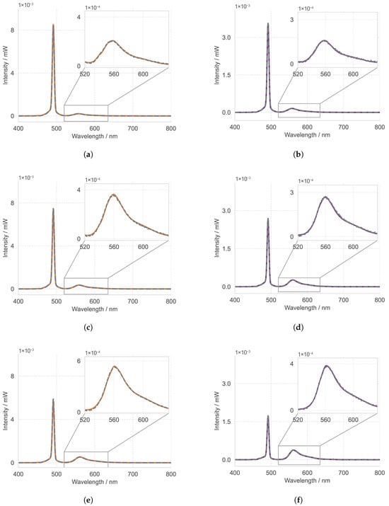 Figure 2 and Table 1 show the fitted spectra and quantum yields for the three Rhodamine 6G concentrations. The statistical uncertainty is derived from the square root of the diagonal elements of the covariance matrix obtained in the Levenberg–Marquardt optimization. The excitation peak, visible in both transmission and reflectance spectra in Figure 2, decreases with increasing dye concentration. This is attributed to stronger absorption of the excitation light and thus enhanced fluorescence emission. The spectral shape and position of this peak are determined by the optical properties of the sample. Additional contributing factors include the integrating sphere model and the calibrated source spectrum. Notably, these are independent of the fitted or the emission PDF. Therefore, deviations between the simulation and measurement in the relative heights of the excitation peaks can be indicative of errors in the optical properties: for instance, an overestimated scattering coefficient would decrease the transmission peak while increasing the reflectance signal. This effect is analogous to that of an incorrect sample thickness. According to the light propagation model [29], an error in the sample thickness translates roughly linearly into an error in the retrieved optical parameters (e.g., a 5% thickness error propagates almost linearly to ≈5% in and ). This, in turn, affects the predicted fluorescence and excitation characteristics. Hence, the excitation peak serves as an internal consistency check, unaffected by the outcome of the optimization. In contrast, the magnitude of the fluorescence signal is highly sensitive to the value of . An overestimated would lead to an excess emission in both transmission and reflectance spectra, while an underestimated to lack of emission. All values are reported with two decimal places.