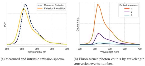 The energy transfer processes within fluorescent molecules can be effectively visualized using the Jablonski diagram [1,24]. Following photon absorption, a molecule is excited into a higher vibronic state of an electronic level (e.g., or ). According to the Franck–Condon principle [25,26], these transitions occur vertically in the Jablonski diagram due to the disparity between rapid electronic excitation and slower nuclear motion. As a result, molecular geometry remains unchanged during excitation. Subsequently, the molecule undergoes ultrafast internal conversion, typically within femto- to picoseconds. This process dissipates excess vibrational energy non-radiatively to the environment, leading to relaxation of the molecule to the lowest vibronic level of . By definition, this non-radiative relaxation occurs without photon emission. Fluorescence emission then takes place through the radiative transition from the lowest excited singlet state () to the ground electronic state (), accompanied by the emission of a photon. This behavior is encapsulated by the Kasha rule [27], which states that fluorescence predominantly arises from the lowest excited singlet state (), regardless of the initially excited electronic state (e.g., or higher). As fluorescence emission consistently occurs from the same initial state () and is predominantly determined by molecular structure, the quantum yield is effectively independent of the excitation wavelength . In the absence of additional decay pathways, such as non-radiative quenching or energy transfer mechanisms, the fluorescence quantum yield remains constant for a given material, irrespective of the specific excitation wavelength [1]. The spectral distribution of emitted photons is characterized by a normalized probability density function (PDF), denoted as , satisfying the following normalization condition: