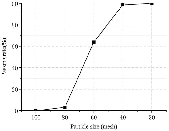 The rubber powder was waste tire rubber powder produced by China Gansu Luqiao Shanjian Technology Co., Ltd., and the rubber powder production process was carried out at the ambient temperature, with a maximum particle size of 40 mesh. Its gradation curve is shown in Figure 1, and the test results of the physical and chemical indexes of the rubber powder are shown in Table 2 and Table 3, respectively.