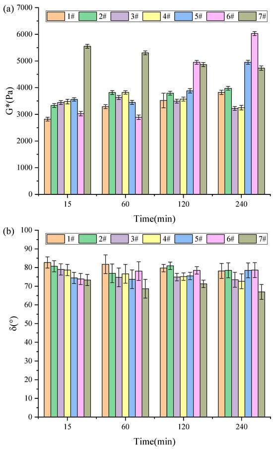 3.2.1. Complex Modulus G* and Phase Angle δ