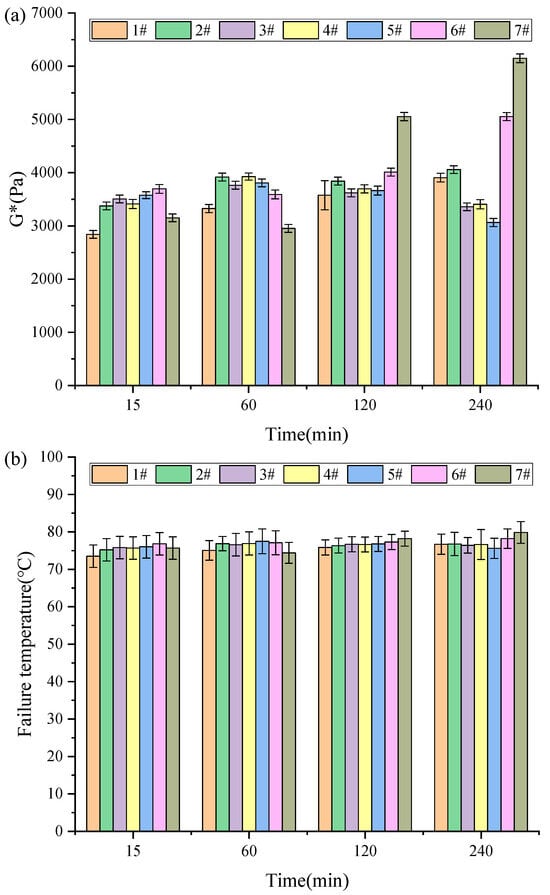 Different activated rubber asphalt rutting factor (a) and failure temperature (b) test results.