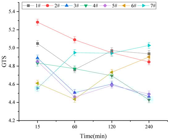 The high-temperature rheological properties of activated rubber asphalt were analyzed using Dynamic Shear Rheometer (DSR) testing at temperatures of 58 °C, 64 °C, 70 °C, 76 °C, and 82 °C. The high-temperature sensitivity of activated rubber asphalt was then calculated. The Global Temperature Sensitivity (GTS) results for different activated rubber asphalt samples are presented in Figure 5. The GTS value represents the sensitivity of asphalt to temperature changes under high-temperature conditions. A higher GTS value indicates poorer high-temperature sensitivity, while a lower value suggests better performance.