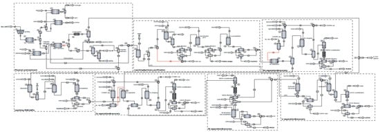 Figure 1 presents the mathematical model developed for the recycling process of spent LIBs with processing capacities of 1314 kg/h, which fall within the range reported for other industrial facilities in the literature. As shown, the mathematical model involves sequential processing of spent LIBs (lithium–nickel–manganese–cobalt oxide cathode material), leading to the recovery of nickel and lithium in the form of carbonates and manganese and cobalt in the form of sulfates. In addition, the recycling plant generates by-products that are either used for process integration or which are valorized alongside the main products. The process is divided into the following subsystems: