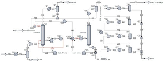 Considering the importance of CO2 capture in the industrial sector, the recycling plant of spent LIBs was coupled with a post-combustion CO2 capture system based on an amine absorption process. According to Figure 2, the CO2 capture process involves the following three major steps: (i) Absorption of CO2 into the lean amine solution at a temperature of approximately 35–55 °C and a pressure of 1.05 bar. (ii) The rich amine-CO2 stream is pumped and heated to a temperature of about 100–120 °C using the hot mass of solvent from the bottom of the desorption column. After preheating, the CO2-rich stream is passed to the desorption column where the solvent is regenerated using thermal energy provided by the recycling plant. (iii) The CO2 stream is dried and compressed in four stages up to the storage pressure of 122 bar.