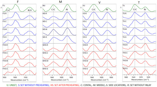 Representative ATR–FTIR spectra of unset and set materials obtained at different locations and temperature conditions with the analytical and reference bands used for DC% measurements are illustrated in Figure 3. The quantitative results per material are presented in Table 2. The mean DC% values of the specimens irradiated under the onlays subjected to three-way ANOVA (independent variables: “material”, “condition” and “location”) showed no statistically significant difference among the different levels of “location” and the effect of differences in “material” and “condition” (p = 0.194). A statistically significant interaction was found between “material”–“location” (p = 0.020), while there was an insignificant interaction between “condition”–“location” (p = 0.635) and “material”–“condition” (p = 0.425). In the non-preheated mode, significant differences were found between F–T, F–M, F–V (p < 0.001) and V–T (p = 0.03), whereas in the preheated mode the significant differences were limited between F–M (p = 0.008), F–T (p = 0.032) and F–V (p = 0.046). For the variable “condition”, significant differences were found only in F (p = 0.024) and T (p = 0.036) between preheated and non-preheated groups. To compare the DC% per material vs. the individual controls (40 s direct light exposure) under the two heating conditions, one-way ANOVA (M, T, V) or one-way ANOVA on Ranks (normality failure for F) were used. For all materials, the DC% values were significantly higher in the controls. No significant differences were found between the controls per material (non-preheated vs. preheated) when tested separately (t-test).