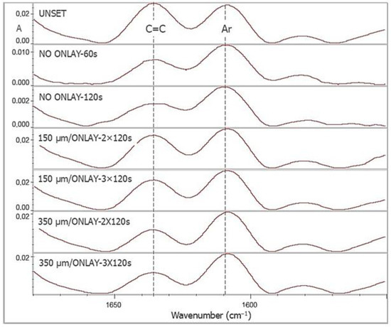 ATR–FTIR spectra of T film, unset/set without onlays and set under onlays at 150 and 350 μm thickness, with the bands used for DC% measurements (absorbance scale).