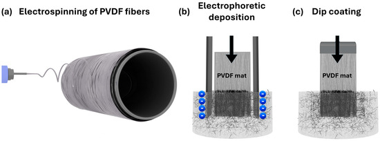 Schematic illustration of the processing steps used in this study: (a) electrospinning of PVDF mats, (b) electrophoretic deposition of CNTs onto electrospun PVDF mats (blue spheres represent schematic illustration of electric charges), and (c) dip coating of CNTs onto electrospun PVDF mats.