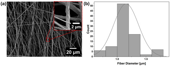 Aligned electrospun PVDF fibers were fabricated as the base material for further surface modification via CNT deposition. The use of aligned fibers was motivated by their improved mechanical performance and enhanced electrical properties because fiber alignment enables more continuous and efficient conductive pathways for directional charge transport within the fibrous network [24]. The electrospun PVDF fibers exhibited a slightly wrinkled surface morphology, as shown in Figure 2a. This feature is typically associated with phase separation and vapor-induced instabilities that occur during fiber solidification under moderate humidity conditions [25]. In the present study, electrospinning was carried out at 60% relative humidity and 25 °C, conditions that are known to promote such effects. A previous study reported similar morphological characteristics, where elevated humidity levels led to wrinkling and porosity formation in PVDF fibers due to vapor-phase interactions during jet elongation and solvent evaporation [26]. Quantitative analysis of the fiber diameters revealed an average value of 1.12 ± 0.21 µm, consistent with values reported in previous studies [27]. Figure 2b shows the corresponding diameter distribution as a histogram, demonstrating a narrow and symmetric spread.