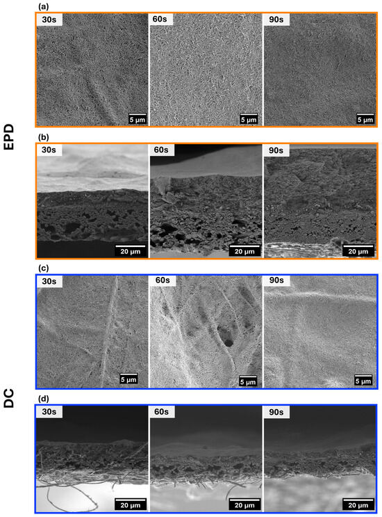 PVDF mats coated with CNTs using EPD and DC are referred to as EPDX and DCX, respectively, where X indicates the deposition time of 30, 60, or 90 s. Figure 3 shows SEM images of the morphology of CNT coatings formed on electrospun PVDF mats using EPD or DC. There is a clear difference in layer uniformity between these two techniques. In EPD60 and EPD90 (Figure 3a), the CNTs form a uniform, continuous film that completely covers the fiber surface. The deposited layer appears dense and well-integrated with the fibrous structure, indicating strong adhesion and effective particle accumulation during the EPD process [28]. However, for EPD30, localized thickening of the CNT layer is observed around individual fibers. As the deposition time of CNTs increases, these accumulations transition into a more homogeneous CNT layer that covers the entire fiber surface and minimizes exposed regions, see Figure 3a for EPD60 and EPD90.