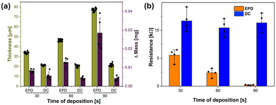The electrical behavior of EPD and DC mats was examined using the two-point probe method to investigate the influence of CNT layer morphology on the resulting electrical conductivity. Resistance values were collected for samples prepared via EPD and DC, using electrode spacings of 1 cm. The results are visualized in Figure 4b.