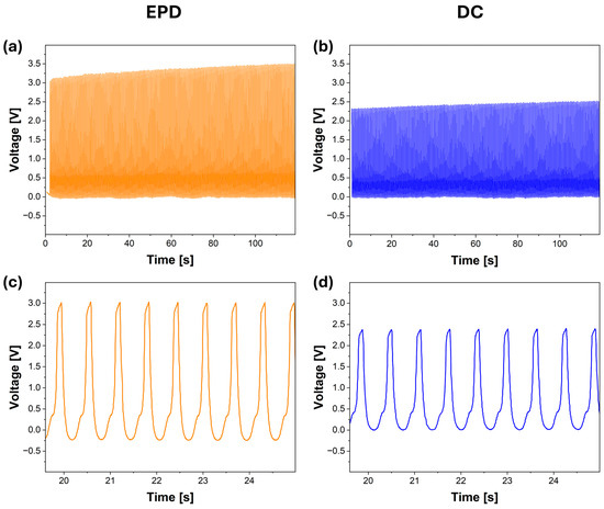 Voltage response of tapping sensors based on electrospun aligned PVDF fibers coated with CNTs: (a) voltage signal over a 180 s period for sample EPD60, (b) voltage signal over a 180 s period for sample DC60, (c) zoomed-in response over a 5 s window for EPD60, (d) zoomed-in response over a 5 s window for DC60. Orange and blue indicate EPD- and DC-modified samples, respectively.
