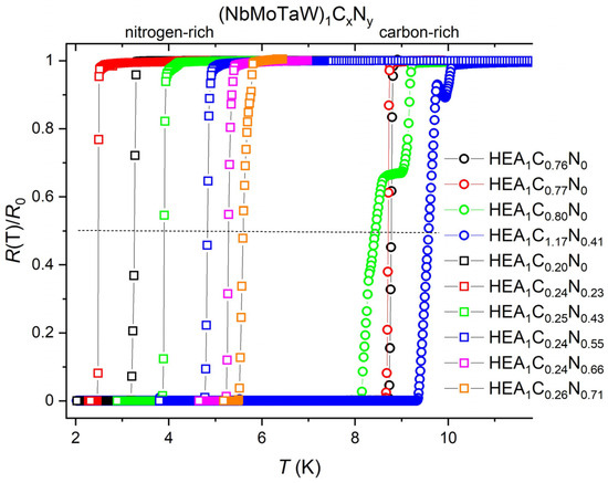 R(T)/R0 dependencies of (NbMoTaW)1CxNy films in zero magnetic field, where R(T) denotes the temperature dependence, and R0 is the resistance just above the transition temperature (TC) onset. The samples are labeled based on Table 1.