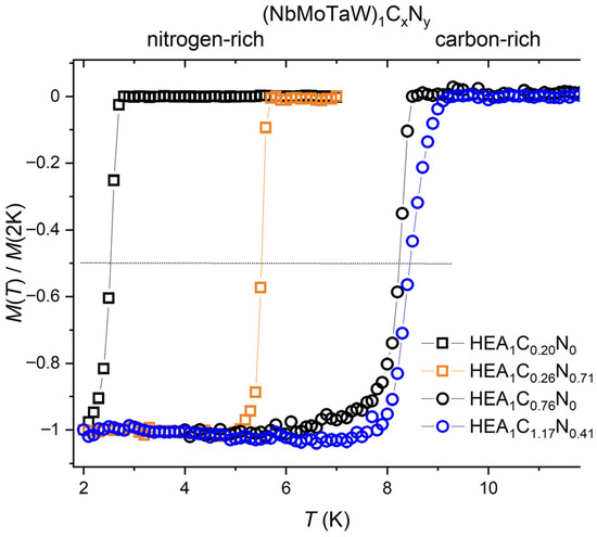 From the displayed TC vs. VEC dependencies one can see that the TC values of all carbonitrides lie inside the dome bordered by the trendline [42] (including the carbonitrides studied in [13]). And, also from here it turns out that the incorporation of N and C into HEAs has a different impact, and that high C concentration leads to a more pronounced TC enhancement. However, as for example, the TC of MoC (with a total VEC = 5) reaches a value of 14.3 K, which exceeds the value of TCmax ≈ 11 K, it is not excluded that also some high entropy carbonitrides or high entropy carbides will not obey the Mattias TC vs. VEC rule [42] and provide a higher TC.
