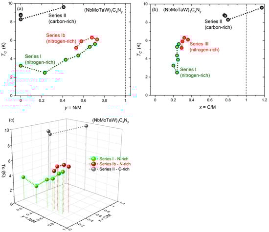 Transition temperature (TC) dependencies of the (NbMoTaW)1CxNy films: (a)—on nitrogen concentration y, (b)—on carbon concentration x, and (c)—as a three-dimensional display of TC vs. x = C/M and y = N/M.