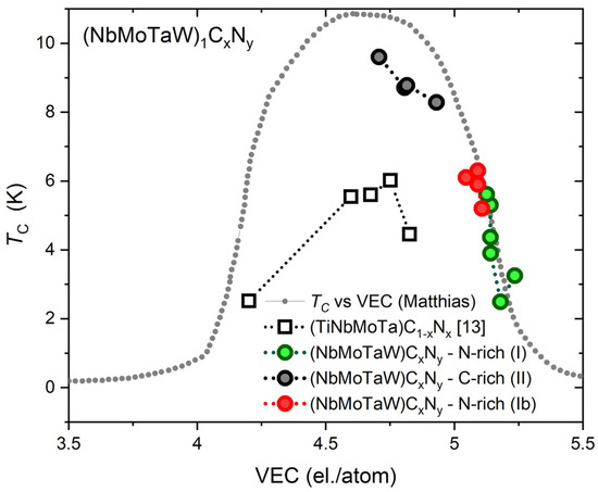 To take a closer look at how TC develops with the overall VEC of studied high entropy alloy carbonitrides (including the VEC of N atoms with VEC = 5 and C atoms with VEC = 4), Figure 5 shows this dependence for the above-discussed (NbMoTaW)1CxNy films. The upper gray trend line in this figure with a dome-like shape represents the TC vs. VEC dependence for transition metals and their alloys in the crystalline form taken from ref. [42]. This trend line is often referred to as the Matthias TC vs. VEC rule and exhibits a maximum of TCmax ≈ 11 K near VEC ≈ 4.7 el./atom (a second dome-like dependence obtained in [42], not shown in Figure 5, with a maximum of TCmax ≈ 16 K is formed at VEC ≈ 6.5 el./atom, see also [18,20]).