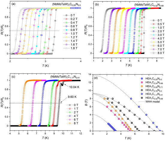 To obtain further information about the superconducting properties of the (NbMoTaW)1CxNy films, resistance R(T) measurements in different magnetic fields B were carried out. Figure 6a shows the R(T) dependence of these films exposed to magnetic fields between 0 T and 8 T, demonstrating the decrease of TC with increasing B. As a criterion for the TC determination in magnetic fields, we used again the temperature value at which 50% of the normal state resistance R0 just above TC was reached. From these results we constructed the corresponding upper critical magnetic field Bc2 vs. T phase diagrams (see Figure 6d). The observed Bc2 vs. T dependencies were described by the Werthamer–Helfand–Hohenberg (WHH) model [44], which for a nitrogen-rich sample with x = 0.26 and y = 0.71 (TC = 5.61 K) provides a Bc2 value of 9.16 T and for a carbon-rich sample with x = 1.17 and y = 0.41 (TC = 9.6 K) a Bc2 value of ~13.8 T. On the other hand, the nitrogen-free HEA (x = 0) shows a Bc2 value of ~4 T. It should be added that in the WHH model, both spin paramagnetism and spin–orbit scattering are taken into account; however, it can be seen that spin–orbit interaction destroys the spin as a good quantum number and brings the superconducting state closer to that of the normal one (and therefore has a direct implication for TC).