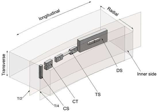 Schematic diagram of specimens’ direction and location. T is the thickness of the forging. CS represents the Cv impact specimen, CT represents the fracture toughness specimen, TS represents tensile specimen, and DS represents the Pellini drop weight specimen.