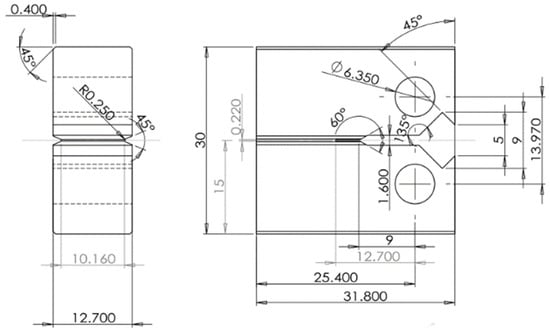 The fracture toughness during the ductile–brittle transition zone was tested according to the single temperature method specified in ASTM E1921-19b [17]. The compact tension (CT) specimen was selected, the thickness of the specimen was 12.7 mm, and the specific dimensions are shown in Figure 2. There was a side groove on each side of the specimen. The stress intensity factor K was used to control the preformed fatigue crack, and the maximum stress intensity factor Kmax was gradually reduced by continuous smoothing. Fatigue pre-cracking was conducted at room temperature with a stress ratio (R) of 0.1. The test temperature was preset according to ASTM E1921-19b [17]. The temperature of the test specimen was controlled by the low-temperature environment chamber, in which the temperature sensor did not have contact with the specimen. The cooling medium during the test was liquid nitrogen. The self-pressurized liquid nitrogen tank and solenoid valve were used to realize automatic temperature control, and the temperature control error was less than ±0.3 °C. After reaching the preset temperature, the specimen was maintained for at least 30 min to ensure temperature homogeneity and then the test was started.