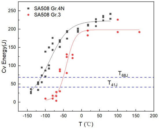 The Cv impact tests at a series of temperatures were carried out, and the results are shown in Figure 3. The black square and the red dot are the Cv impact energy of SA508 Gr.4N steel and SA508 Gr.3 steel, respectively. The impact transition curve (black line and red line) was fitted according to the hyperbolic tangent function. The characteristic values of the Cv impact test and RTNDT results are shown in Table 3. The upper shelf energy (USE) of SA508 Gr.4N steel was 24.3 J higher than that of SA508 Gr.3 steel, while the characteristic temperatures T41J and T68J of SA508 Gr.4N steel were 70 °C and 61.2 °C lower than those of SA508 Gr.3 steel, respectively. With the content of Cr and Ni elements increased, SA508 Gr.4N steel showed better toughness in the low-temperature region than SA508 Gr.3 steel. Moreover, the RTNDT of SA508 Gr.4N steel was approximately 90 °C lower than that of SA508 Gr.3 steel, which was a significant improvement compared to the −12 °C required in the ASME code [2]. As for the fracture toughness index (RTNDT) used in engineering evaluation, SA508 Gr.4N steel performed particularly well.