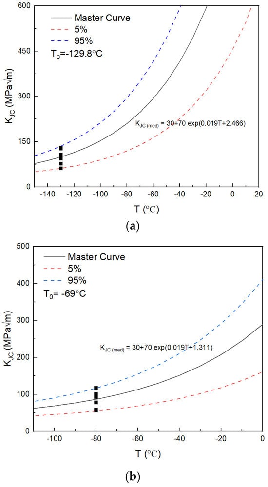 Standard master curve and KJC value for (a) SA508 Gr.4N steel and (b) SA508 Gr.3 steel. The black boxes are the values of KJC.