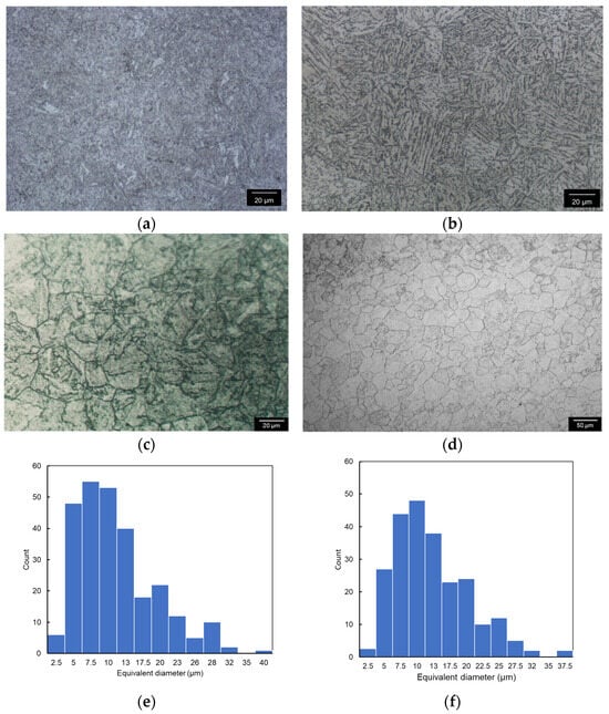 Optical microscope photographs of SA508 Gr.4N steel and SA508 Gr.3 steel: (a,b) represent the optical microstructure of SA508 Gr.4N steel and SA508 Gr.3 steel, (c,d) represent the grain size of SA508 Gr.4N steel and SA508 Gr.3 steel, (e,f) represent the grain size statistics of SA508 Gr.4N steel and SA508 Gr.3 steel.