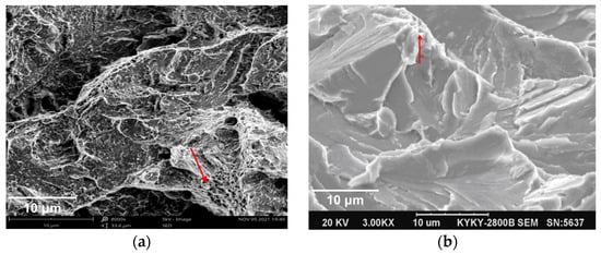 The fracture morphology of SA508 Gr.4N steel and SA508 Gr.3 steel was carried out using scanning electron microscopy (SEM) on the samples near the lower shelf of the transition curve. The observation of SA508 Gr.4N steel was carried out using the Cv impact specimens at −130 °C, while the SA508 Gr.3 steel was carried on the impact specimens at −80 °C. The microscopic fracture in Figure 6 showed that the fracture surface was composed of a series of small cleavage planes, the river pattern morphology was formed on the cleavage steps, and the fracture surface was characterized by cleavage fracture. Most of the tear edges were obvious and smooth, and many slender river-like lines were distributed in each area, and the flow of the river was the direction of crack propagation. In the crack propagation zone, there were small areas of shallow dimpling (indicated by the red arrow in Figure 6), showing that there was still a certain ductile fracture zone at the tear end even in the brittle state. Secondary cracks existed in the instantaneous fracture zone of SA508 Gr.3 steel, and the cracks are relatively deep. Comparing the fracture characteristics of the two materials in Figure 6, it can be known that there was no significant difference in the river length between the two materials, but the cleavage step density of SA508 Gr.4N steel was slightly higher than that of SA508 Gr.3 steel. The distribution area of shallow dimples in SA508 Gr.4N steel was still larger than SA508 Gr.3 steel. Therefore, to a certain extent, it indicated that the fracture toughness of SA508 Gr.4N steel was superior.