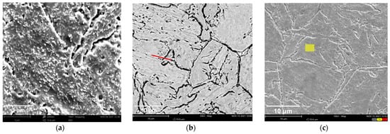 In order to prove the above analysis, the composition analysis of the X-ray energy spectrometer (EDS) in the inner region of the grain and the region across the grain boundary was carried out. The results are shown in Table 4. It was found that the Fe content was the highest, and the Cr, O and C were contained in a small amount, both in the ferrite grain and near the grain boundary. When the EDS line scanned through the grain boundary region, there was a sharp increase in C content or C and Cr content on the line sweep path, indicating that there was an obvious carbide precipitate on this path. So, it is likely to be a Cr-rich carbide precipitate (M7C3 or M23C6). This result is consistent with the reference [20]. At the same time, the probability of finding Cr element in the surface area of SA508 Gr.4N steel is higher than that of the SA508 Gr.3 steel examined in reference [20], which is consistent with the SEM observation.