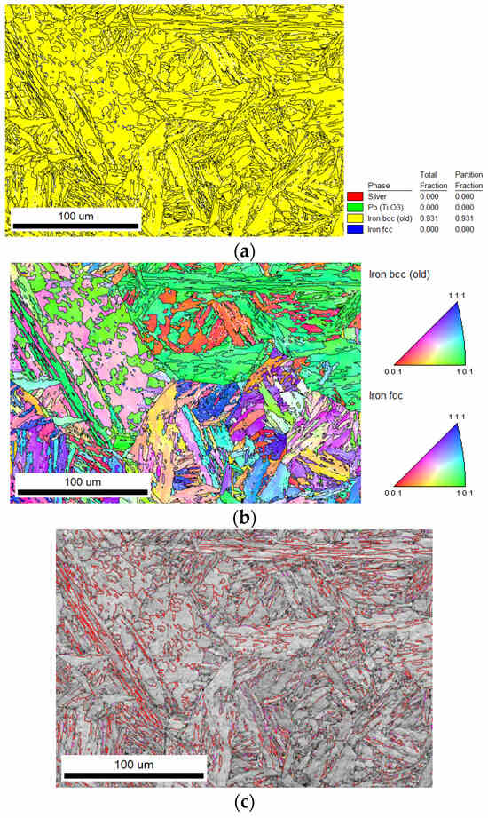 The EBSD of SA508 Gr.4N steel: (a) phase composition; (b) grain orientation; (c) grain boundary orientation.