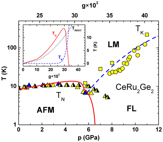 We should also mention some important limitations that one should be aware of when analysing the experimental data in such a simplified way. The phase diagram is obtained by considering the competition between the Kondo and RKKY interactions, but more complex many-body effects, such as valence fluctuations or multipolar interactions, are neglected, even though they may be important near quantum critical points. Furthermore, the scaling approach used to derive the renormalized coupling constant assumes a paramagnetic background which is no longer satisfied once a long-range order is established. The assumed linear dependence of the exchange coupling constant on external control parameters (pressure or doping) fits well with the experimental data. However, the underlying electronic structure may be more complex and involve nonlinear changes in hybridisation, bandwidth, or crystal field under pressure or substitution. The method is based on phenomenological parameters and does not consider the data obtained from the electronic structure calculations. A more realistic treatment [