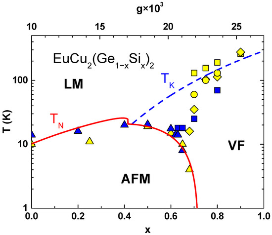 A similar procedure is applied to EuCu2(Ge1−xSix)2, where the T–x phase diagram is computed by treating the Si concentration x as the main variable instead of pressure. For and using eV, , and , the RKKY energy becomes: eV. The best fit to experimental data is obtained using a coupling constant scaled as: .