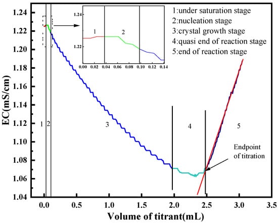 As illustrated in Figure 6b, the initial conductivity of the solution ranged from 1.214 to 1.244 mS/cm. During the titration process, the dividing point between the undersaturation and nucleation stages on the titration curve was indistinct. However, when approximately 0.1 mL of titrant was added, the transition from the nucleation to the crystal growth stage became evident.