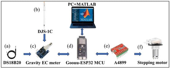 Composition of the self-designed conductive titrator [25]. (a) DS18B20; (b) DJS−1C; (c) Gravity EC meter; (d) Goouuu−ESP32; (e) A4899; (f) Stepping motor.