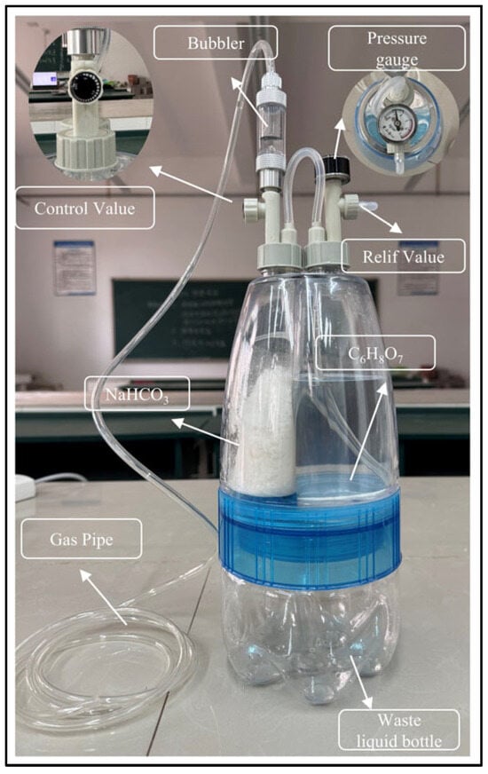 A CO2 generator is employed to eliminate interfering ions such as H+, Cl−, and Ca2+ prior to conductivity titration. The configuration of the low-pressure CO2 generator is illustrated in Figure 3. It primarily comprises a pressure relief valve, pressure gauge, bubbler, control valve, outlet tube, sodium bicarbonate bottle, acid bottle, and waste container. The generator operates based on a pressure balance mechanism: the pressure differential between the acid reservoir and the sodium bicarbonate reaction chamber drives a self-regulating cycle of acid inflow and CO2 generation. The reaction between C6H8O7 and NaHCO3 that produces CO2 is shown in Equation (2).