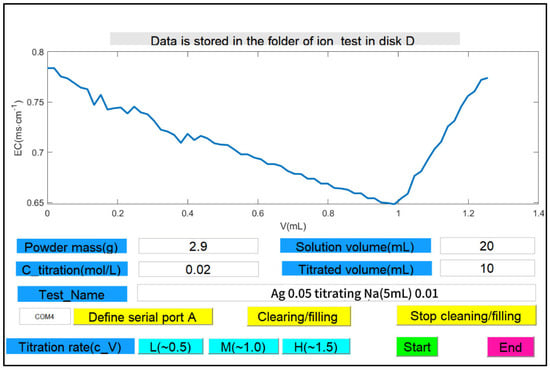 The titration system software comprises the operating system and control program. The operating system is based on the Arduino IDE2.3.2 (Arduino SA, Monza, Italy), which was developed in the C language. The Goouuu-ESP32 MCU is responsible for collecting conductivity and temperature data, controlling the stepper motor for titration, and transmitting data to the computer through the serial port. The control program was developed using MATLAB (R2022b) GUI and communicated with the ESP32 serial port through a dedicated support package to achieve the data acquisition and titration control shown in Figure 5. During operation, the device was connected, and the test could be started after inputting the powder mass, dissolved liquid volume, Ba(NO3)2 concentration, the liquid volume to be measured, the name of the sample, and the serial number of the computer, and the test data were automatically saved in the specified disk in the ‘Ion_test’ file.