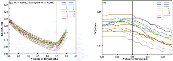 To further investigate the accuracy and stability of the conductivity titration method, it was validated via a recovery experiment and 15 sets of repeatability tests. In the repeatability tests, a 0.02 mol/L Ba(NO3)2 solution was used to titrate 5 mL of a 0.01 mol/L Na2SO4 solution, and the results of 15 repeated titrations are shown in Figure 6. Across 15 titration curves, the changes in this region exhibited a consistent magnitude.
