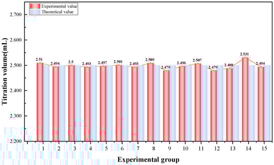 As shown in Figure 7, the comparison between the actual and theoretical values from 15 titration trials reveals a high degree of consistency, indicating strong data stability. The average titration volume of Ba(NO3)2 was 2.498 mL, with a standard deviation of 0.013 mL, a coefficient of variation of 0.52%, and an average relative error of 0.32%. Compared with the 1.13% relative error reported by Garcia’s conductometric titration method [27] and the significantly higher 6.4% error reported by Anechiţei [28], the self-developed conductivity titration system exhibits significantly higher titration accuracy.