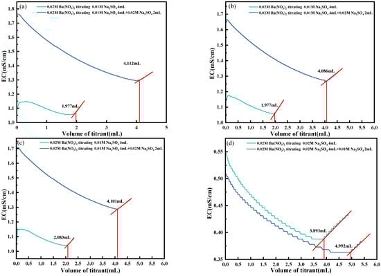 In typical SO42− titrations, BaCl2 is often used as the titrant. However, in the presence of Ag+, Cl− can form AgCl precipitates, interfering with endpoint detection. To avoid such complications, Ba(NO3)2 was used in this study. Its reaction with SO42− forms BaSO4, producing a clear and distinct conductivity change that facilitates accurate endpoint identification.