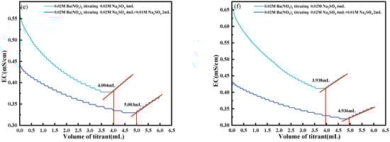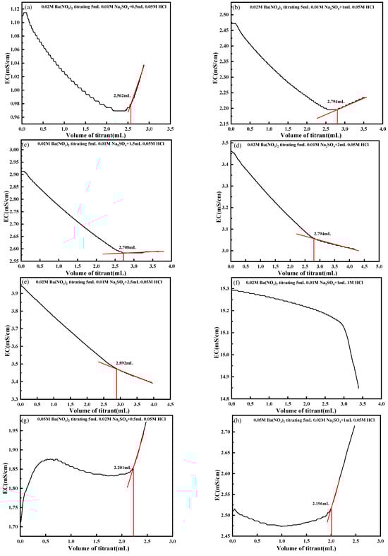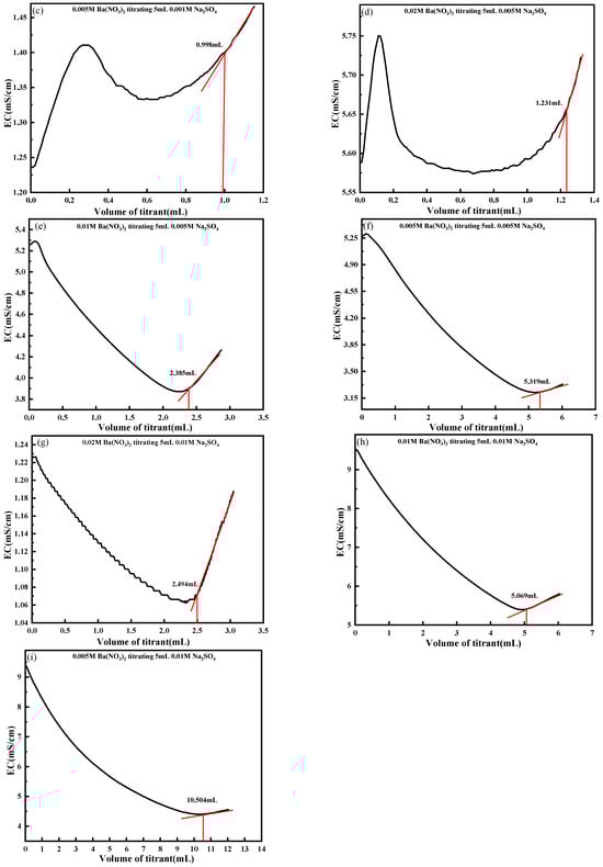 For Group B, as illustrated in Figure 11g–i, 0.02 mol/L Na2SO4 solutions were titrated with 0.05 mol/L Ba(NO3)2, with H+ concentrations adjusted via additions of HCl at varying volumes and concentrations. Experimental results confirm that H+ exerts a significant influence on the conductometric titration of SO42−. When the volume of added HCl exceeds 1 mL, the titration endpoint determination becomes markedly erroneous. During titration, H+ interference complicates the conductivity trend of the solution, impeding accurate data acquisition. In environments with lower H+ concentrations, the impact of H+ on experimental data is approximately 10%. However, when H+ concentrations reach a critical threshold, such as upon addition of 1 mL of 1 mol/L HCl, the conductivity curve exhibits significant distortion. This severe distortion substantially impairs titration endpoint determination, rendering the endpoint indistinguishable.