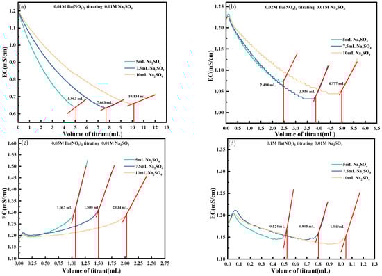 Change in conductivity with the volume of titrant under different titrant concentrations and different titration volumes. (a) 0.01 M Ba(NO3)2 titrating 0.01 M Na2SO4; (b) 0.02 M Ba(NO3)2 titrating 0.01 M Na2SO4; (c) 0.05 M Ba(NO3)2 titrating 0.01 M Na2SO4; (d) 0.1 M Ba(NO3)2 titrating 0.01 M Na2SO4.