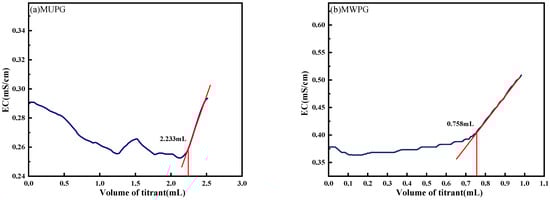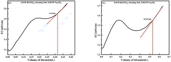 To account for errors caused by environmental changes, usage scenarios, and other factors, a volumetric calibration of the instrument was performed before each test to ensure it was in optimal working condition. The titration volume correction involved the following steps: (1) Step (1) from Section 3.4.2 was followed, and the burette was then filled with the titrant. (2) A total of 5 mL of 0.01 mol/L Na2SO4 standard solution was measured into the centrifugal tube. (3) A magnetic stirrer was placed into the centrifugal tube, and the tube was positioned at the center of the stirrer. (4) Step (3) from Section 3.4.2 was followed, and the burette was placed into the centrifuge tube below the page. (5) The magnetic stirrer was started to ensure that the magnetic rotor did not touch the collision process during stirring. (6) The “Start” button was clicked, and the conductivity titration curve was observed. When noticeable changes in the conductivity titration curve were observed, and the curve showed a linear change trend, titration continued with 0.1–0.2 mL of titrant. (7) The “Send” button was clicked to end the test according to Step (5) from Section 3.4.2.