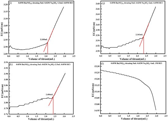 Effect of H+ on the conductivity titration of SO42−. (a) With 0.5 mL 0.05 M HCl added; (b) With 1 mL 0.05 M HCl added; (c) With 1.5 mL 0.05 M HCl added; (d) With 2 mL 0.05 M HCl added; (e) With 2.5 mL 0.05 M HCl added; (f) With 1 mL 1 M HCl added; (g) With 0.5 mL 0.05 M HCl added; (h) With 1 mL 0.05 M HCl added; (i) With 1.5 mL 0.05 M HCl added; (j) With 2 mL 0.05 M HCl added; (k) With 2.5 mL 0.05 M HCl added; (l) With 1 mL 1 M HCl added.