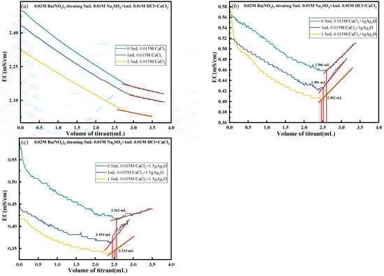 The concentration of Na2SO4 was controlled to remain constant during the experiment, and a specific volume and concentration of CaCl2 and HCl were added, and the amount of Ag2O varied. The results of the experiment are shown in Figure 12. As can be seen from Figure 12b, when the amount of Ag2O was 1 g, the titration endpoint of the solution was easy to judge, and the actual values obtained from the titration were 2.586, 2.501, and 2.482 mL, respectively, close to the theoretical value of 2.5 mL. It demonstrates that an appropriate amount of Ag2O can effectively remove Cl− and H+ from the solution, reducing their interference with solution conductivity. This enhancement in SO42− contribution to solution conductivity improves the accuracy of titration endpoint determination. Figure 12c shows that when the Ag2O amount was 1.5 g, the actual titration values were 2.562, 2.453, and 2.513 mL, respectively, still close to the theoretical 2.5 mL. However, excess Ag2O addition caused the curve change to become non-smooth, complicating endpoint determination. This phenomenon may arise because excess Ag2O, after reacting with H+ to form Ag⁺ ions, further reacts with water to hydrolyze, generating additional Ag⁺ and OH−. The increased OH− concentration raises the solution pH, and under weakly alkaline conditions, SO42− reacts with Ag+ to form soluble complexes, thereby altering solution conductivity.
