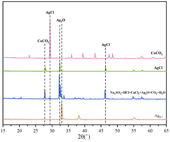 As can be seen from Figure 13, the precipitates obtained by titration after treatment of solutions containing H+, Ca2+, and Cl− are by the theory, and only AgCl and CaCO3 precipitates were produced in the test solutions containing H+, Ca2+, and Cl−. The precipitate SEM after pretreatment by adding Ag2O and CO2 to remove H+, Ca2+, and Cl− is shown in Figure 14. Fine AgCl particles were present in the precipitates, and Ag2O in the precipitates was difficult to observe due to the covering of AgCl. In addition, CaCO3 in the cubic style was present between the precipitates, and no other precipitates were generated, except for AgCl and CaCO3.