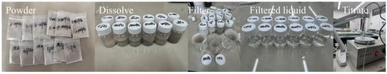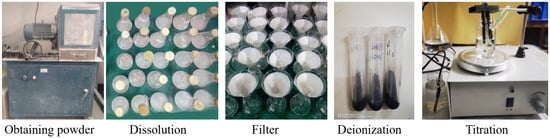 Many harmful impurities, including soluble phosphorus, eutectic phosphorus, soluble fluorine, and organic matter, complicate the direct utilization of PG. However, PG holds significant potential for development as an engineering material. It has been used as a raw material in various applications, including high-performance concrete [29], gypsum board manufacturing [30], retardant production, and lime manufacturing [31]. To evaluate the practicality of the self-developed conductivity titrator and assess the feasibility of reusing PG, the sulfate ion content in six different PG-based gelling materials was determined. The main steps involved in the determination included five stages: powder extraction, dissolution, filtration, and titration, as illustrated in Figure 17.
